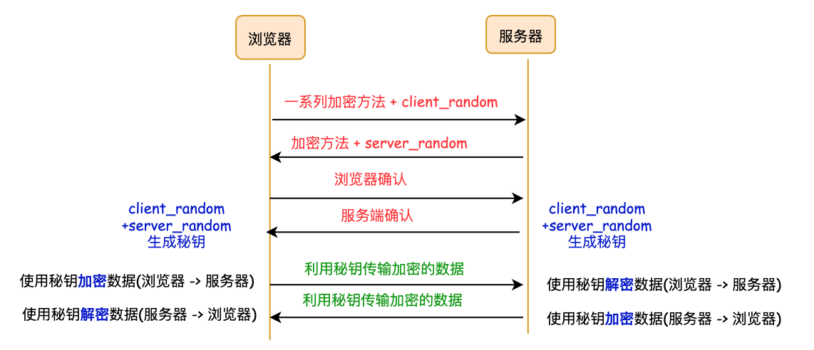 现有浏览器和服务器有了三个相同的凭证:client_randomserver_random和加密方法 用加密方法把 client_randomserver_random 两个随机数混合起来,生成秘钥,这个密钥就是浏览器和服务端通信的暗号。