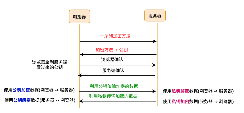 之后浏览器通过公钥将数据加密传输给服务端,服务端收到数据使用私钥进行解密。服务端给浏览器发送数据,则使用私钥进行加密,浏览器收到服务端发送过来的数据,使用公钥进行解密。