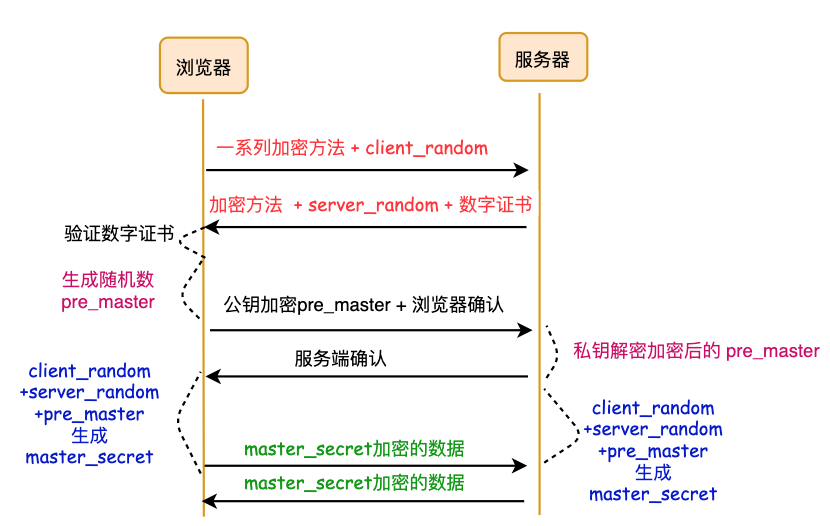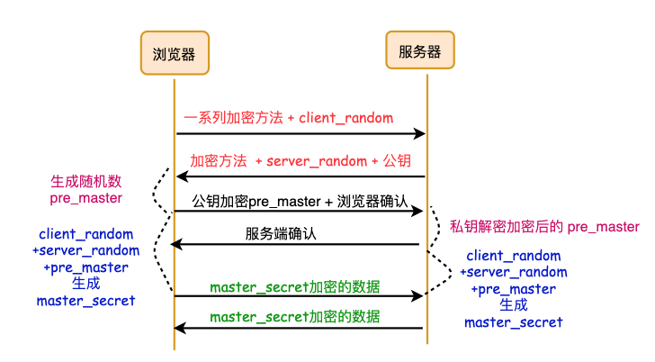 到此为止,服务器和浏览器就有了相同的 client_randomserver_randompre_master, 然后服务器和浏览器会使用这三组随机数生成对称秘钥。有了对称秘钥之后,双方就可以使用对称加密的方式来传输数据了。