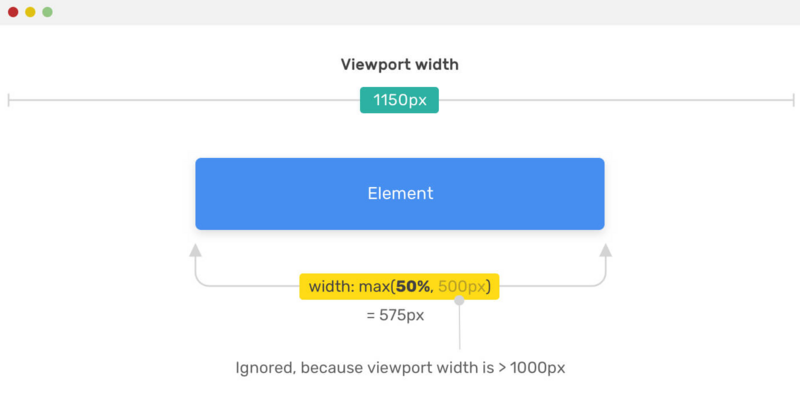 否则,如果50%计算值大于500px,则50%将用作宽度的值,假设视口的宽度是 1150px, 最终元素的宽度为 1150px x 50% = 575px。