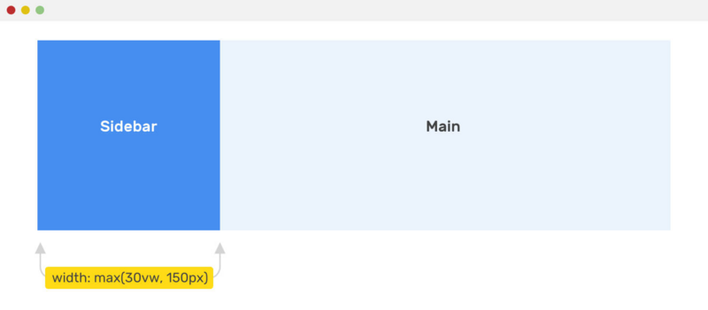 通常,页面的侧边栏是固定的,主界面度是灵活的。 如果视口足够大,我们可以根据视口的大小动态增加侧边栏宽度,这里我们可以使用max()函数为其设置最小宽度。