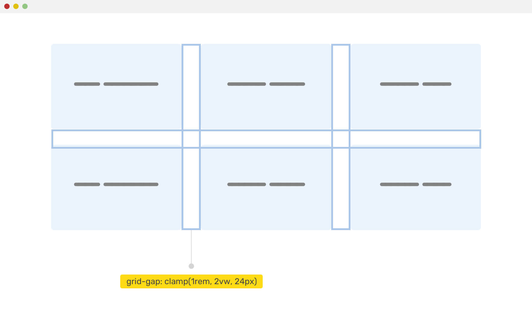 在一个使用风格布局的界面上,如果我们想根据视口大小来调整网格之间的间距,使用 clamp() 是很容易做到的: