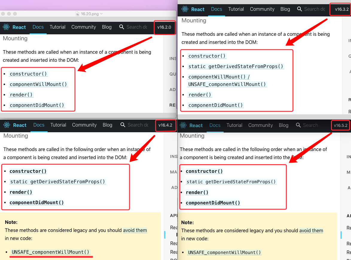 react官网文档中关于 Mounting 加载阶段生命周期历史版本变动: