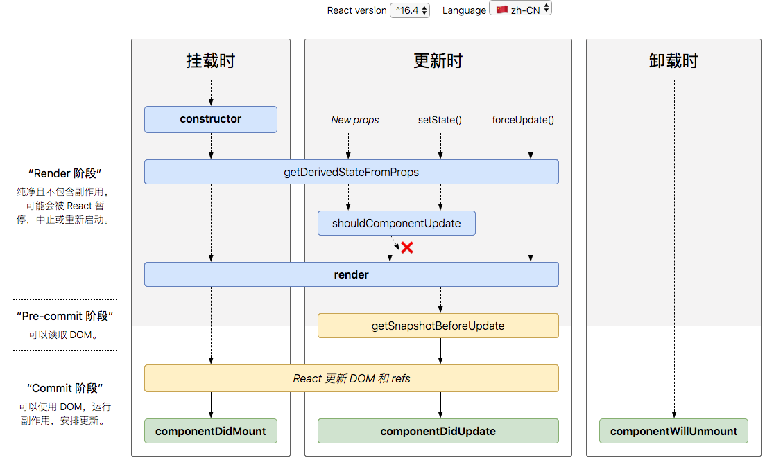 一下介绍的生命周期方法为过时的方法,这些方法仍然有效,但不建议在新代码中使用它们。过时的方法将支持到react17版本中,然后就会删除。
